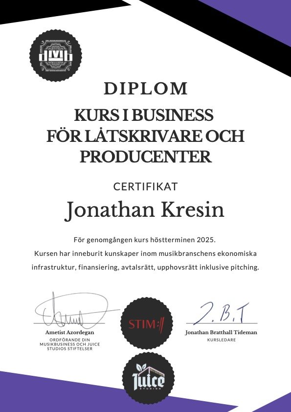 Diploma by Swedish PRO “Stim” and Juice Studios for “Business for Songwriters and Producers”